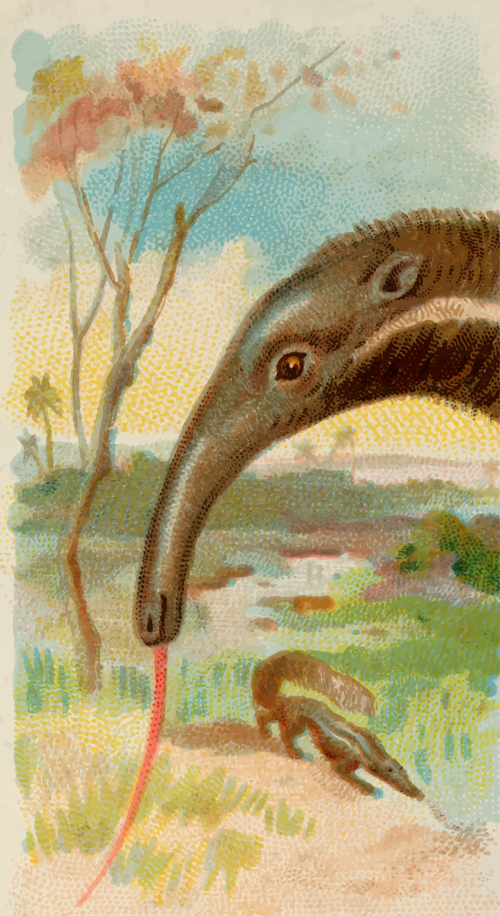 This features a large, long-nosed animal with a red tongue, possibly an elephant or a similar creature. It is standing in the grass and appears to be reaching out towards something on the ground. A small bird can also be seen nearby, walking across the grass. The scene has a vintage feel to it, as if it were drawn by hand with watercolor colors.