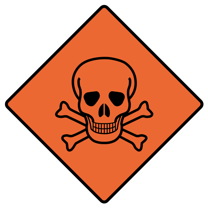 This features a red and orange square with an illustration of a skull and crossbones. This symbol is often associated with danger or warning, as it represents the dangers of poisonous substances such as arsenic or cyanide. The skull and crossbones are placed in the center of the image, surrounded by a white background that contrasts with the bold colors of the square.