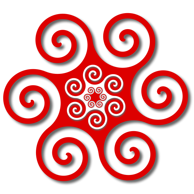 This features a red hexagon with six spirals attached to it. In the center of the red hexagon, there is another white spiral shaped hexagon. This unique design creates an interesting visual effect that draws attention. The red and white colors contrast well against each other, making the overall appearance striking and eye-catching.