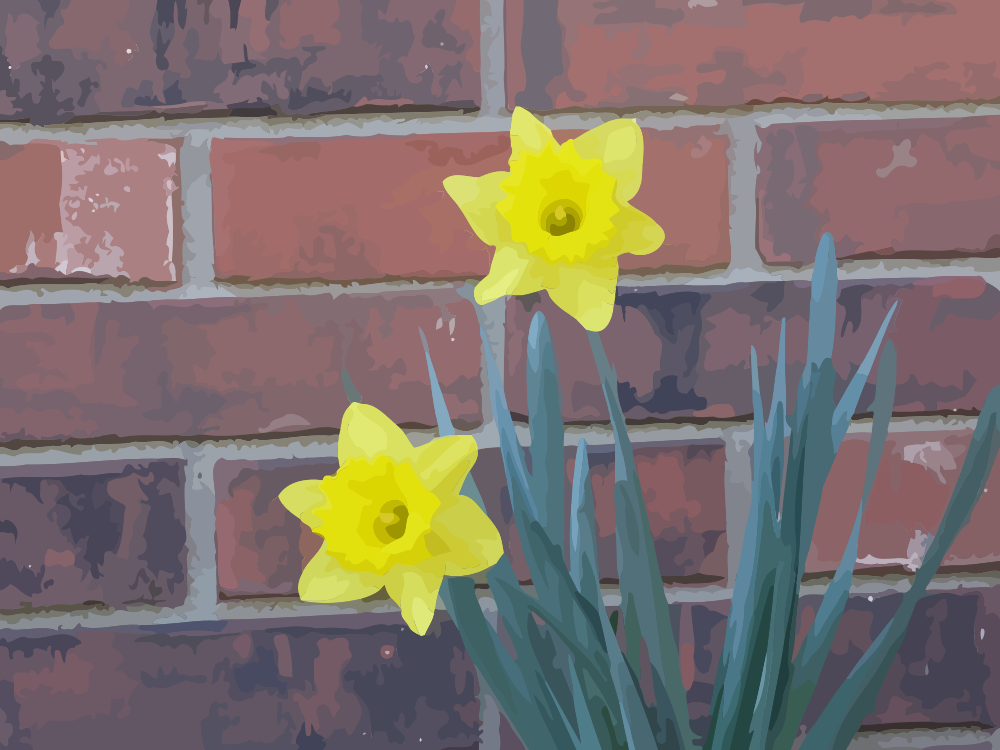 This features a brick wall with two yellow daffodils planted in the middle of it. These flowers are placed on either side of the wall, creating an appealing and natural display. The daffodils are positioned close to each other, adding a sense of harmony to the scene. The brick wall serves as a beautiful backdrop for these vibrant flowers, making the overall composition visually pleasing.