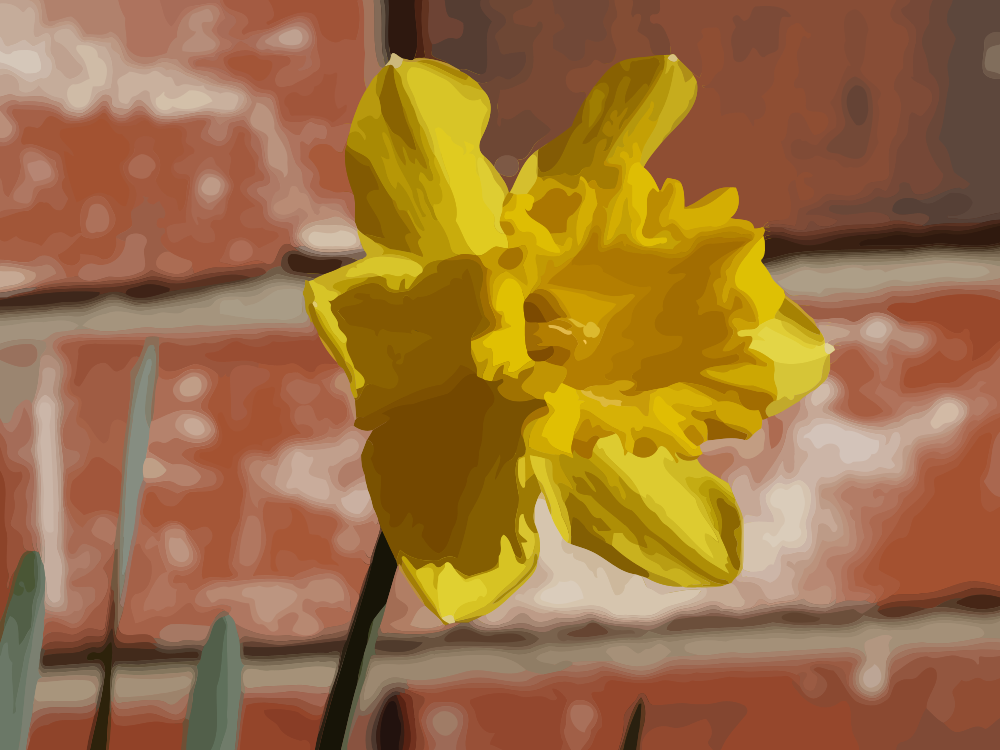 This features a close-up of a traditional yellow daffodil, with its vibrant color and distinctive shape. It is situated in front of a brick wall, which adds an interesting contrast to the natural beauty of the flower. The daffodil appears to be growing from a small plant, possibly a bulb or a seedling, as it sprouts up against the backdrop of the brick wall. This image captures the essence of springtime and the arrival of warmer weather, with the yellow daffodil symbolizing new beginnings and growth.