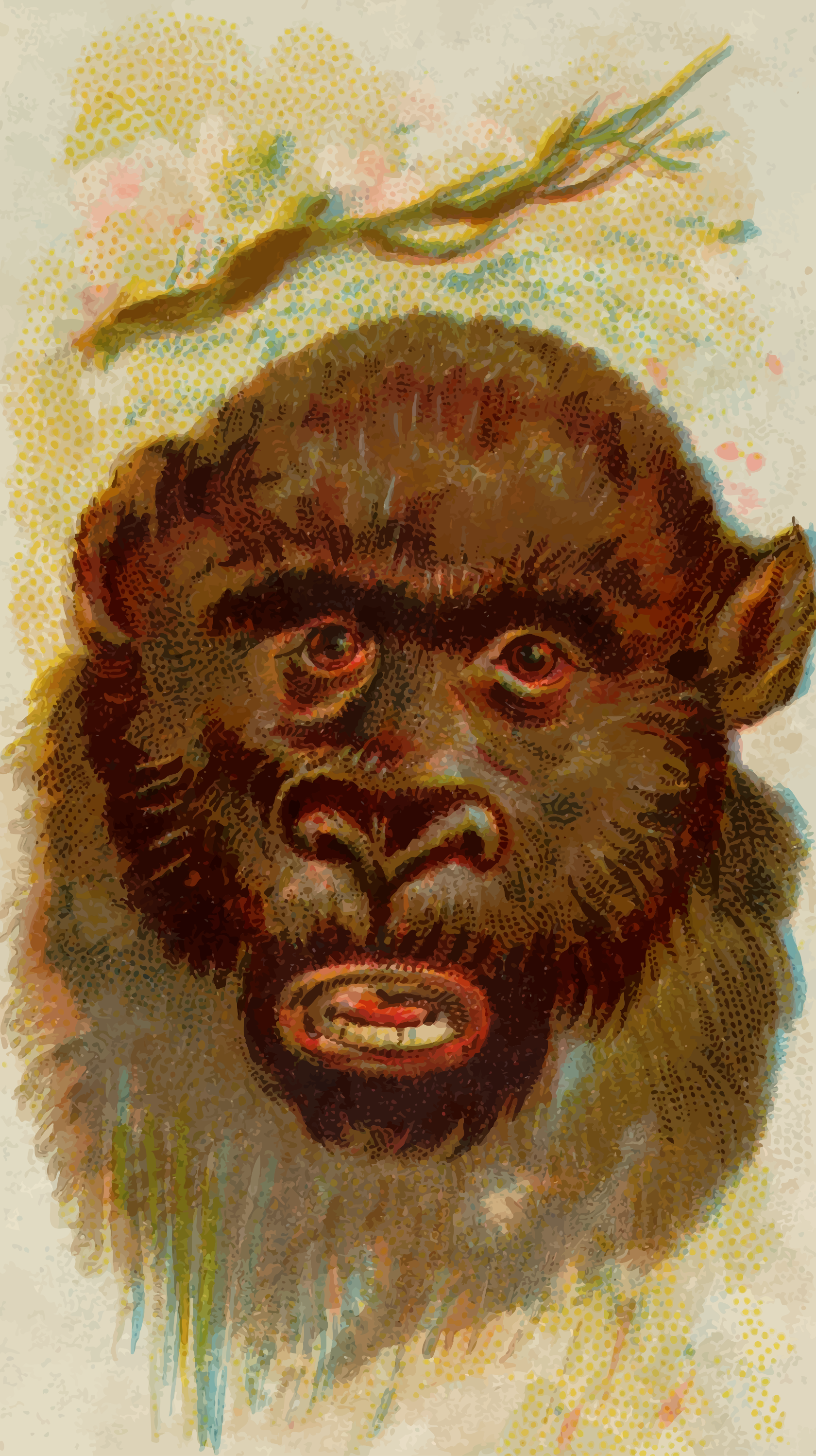 This features a large, detailed illustration of a chimpanzee with its mouth open. The chimp's face is prominently displayed in the foreground, capturing attention and creating an engaging visual experience. The artwork appears to be a part of a series called "Wild Animals of the World," which was created by Allen & Ginter in the late 1800s. As these illustrations are quite old, some restoration work has been done on this particular piece to enhance its appearance and make it more visually appealing. The chimp's mouth is open, possibly indicating that it is making a sound or expressing an emotion. Overall, the image showcases the beauty of wildlife art from a bygone era.