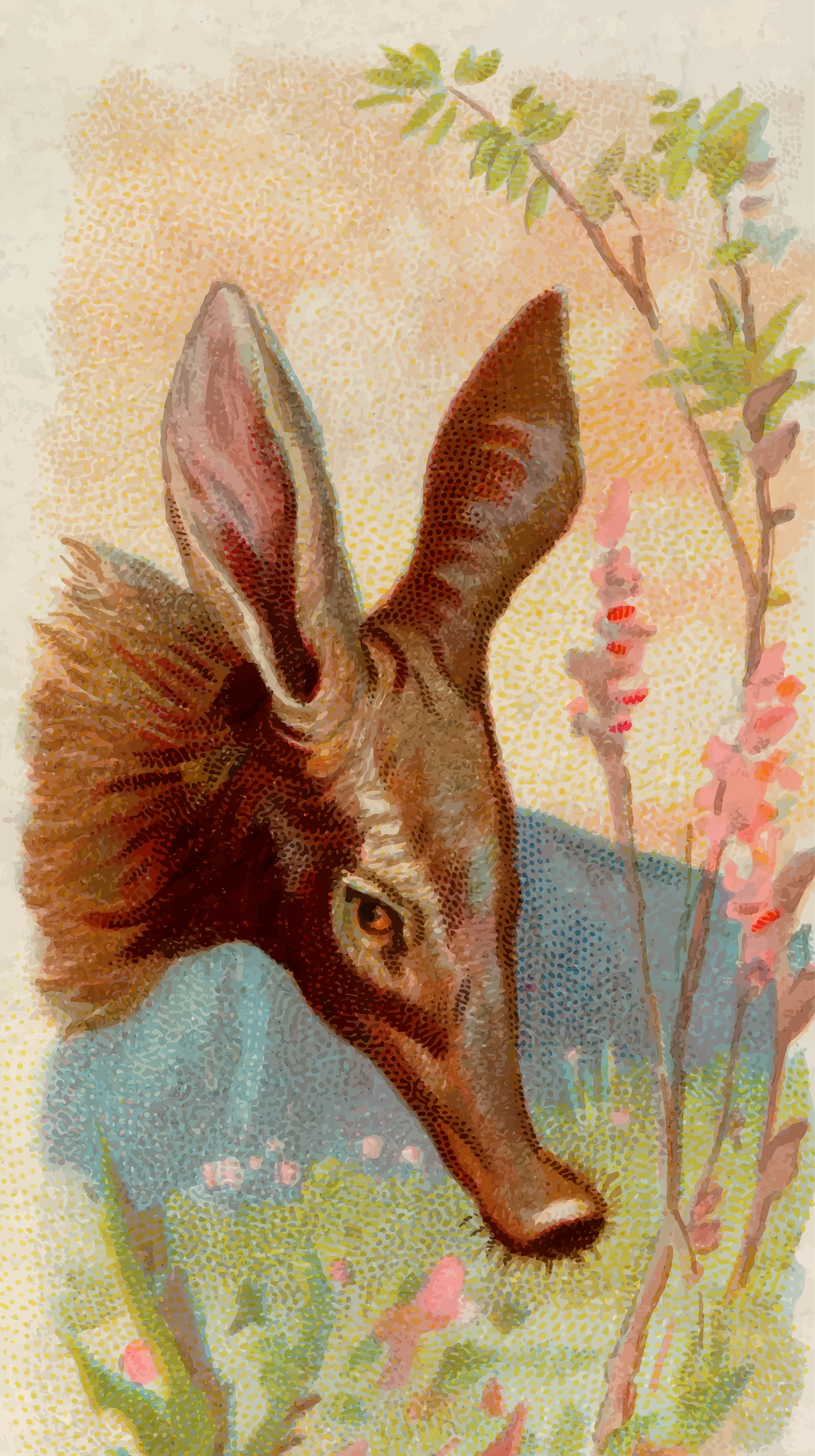 This features a deer with its head tilted to the side, standing in a field of flowers. The deer is surrounded by various pink and purple flowers, creating a beautiful and vibrant scene. The deer's ears are perked up, giving it an alert appearance as if it is listening or observing something. This image could be part of a series of cigarette cards from the late 1800s, showcasing wild animals from around the world.