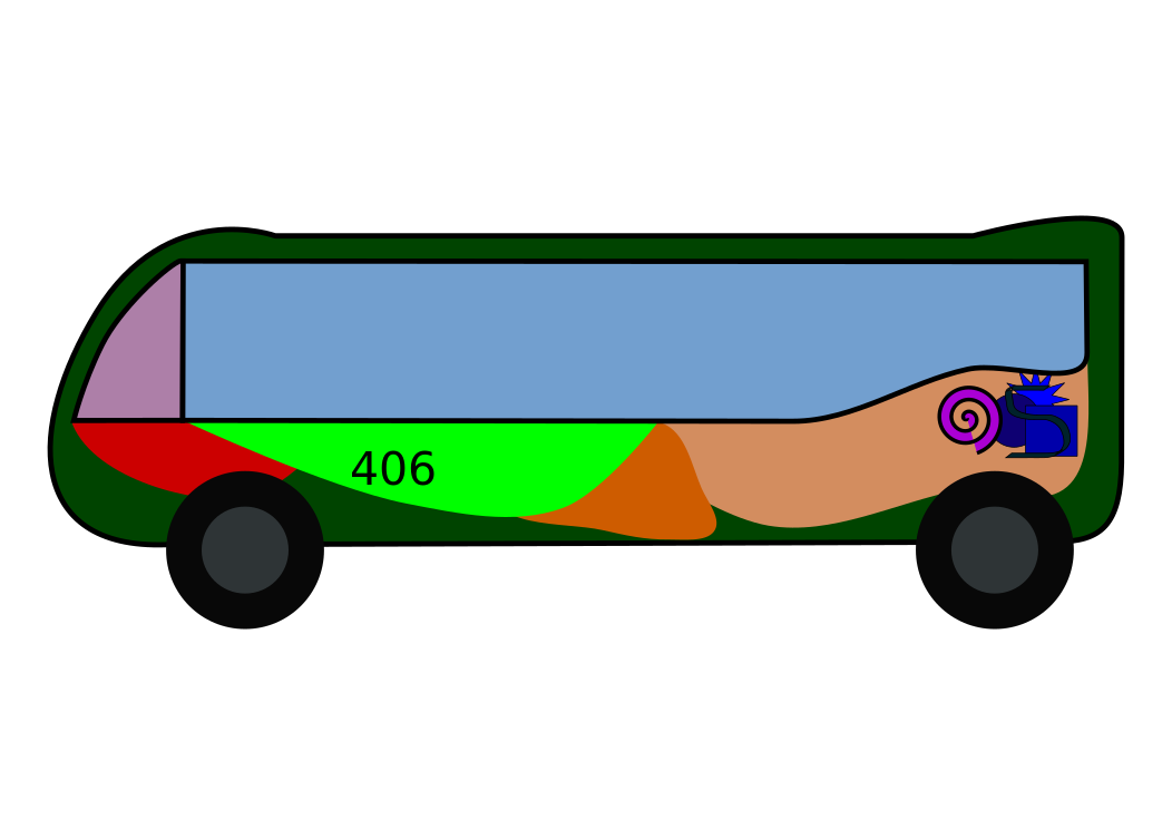 This features a colorful bus with a unique design. It is painted in various shades of green, yellow, and orange, giving it an eye-catching appearance. The bus has a number 406 on the side, indicating its route or destination. The vibrant colors and artistic design make this bus stand out from typical public transportation vehicles.