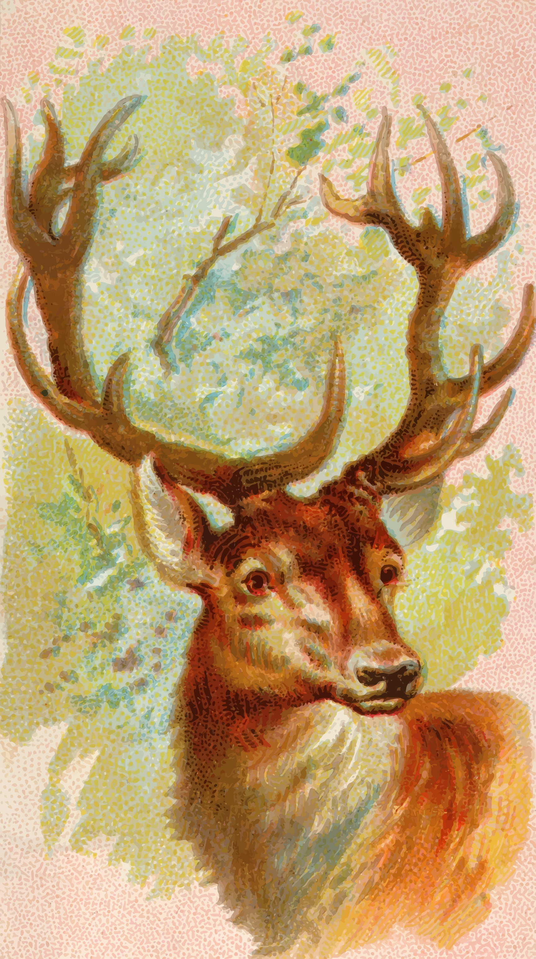 This features a beautifully drawn deer with large antlers, standing in front of trees. The deer appears to be looking at the viewer, capturing their attention. The scene is set against a backdrop of trees and foliage, creating an idyllic and natural atmosphere. The artwork showcases the deer's majestic presence and its connection with nature.