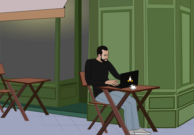 This features a man sitting in a chair at a dining table, working on his laptop. He is surrounded by several chairs placed around the room, with one close to him and others further away. A cup can be seen on the table near the man, possibly containing coffee or another drink. The scene appears to depict a cozy workspace where the man can focus on his tasks while enjoying a warm beverage.