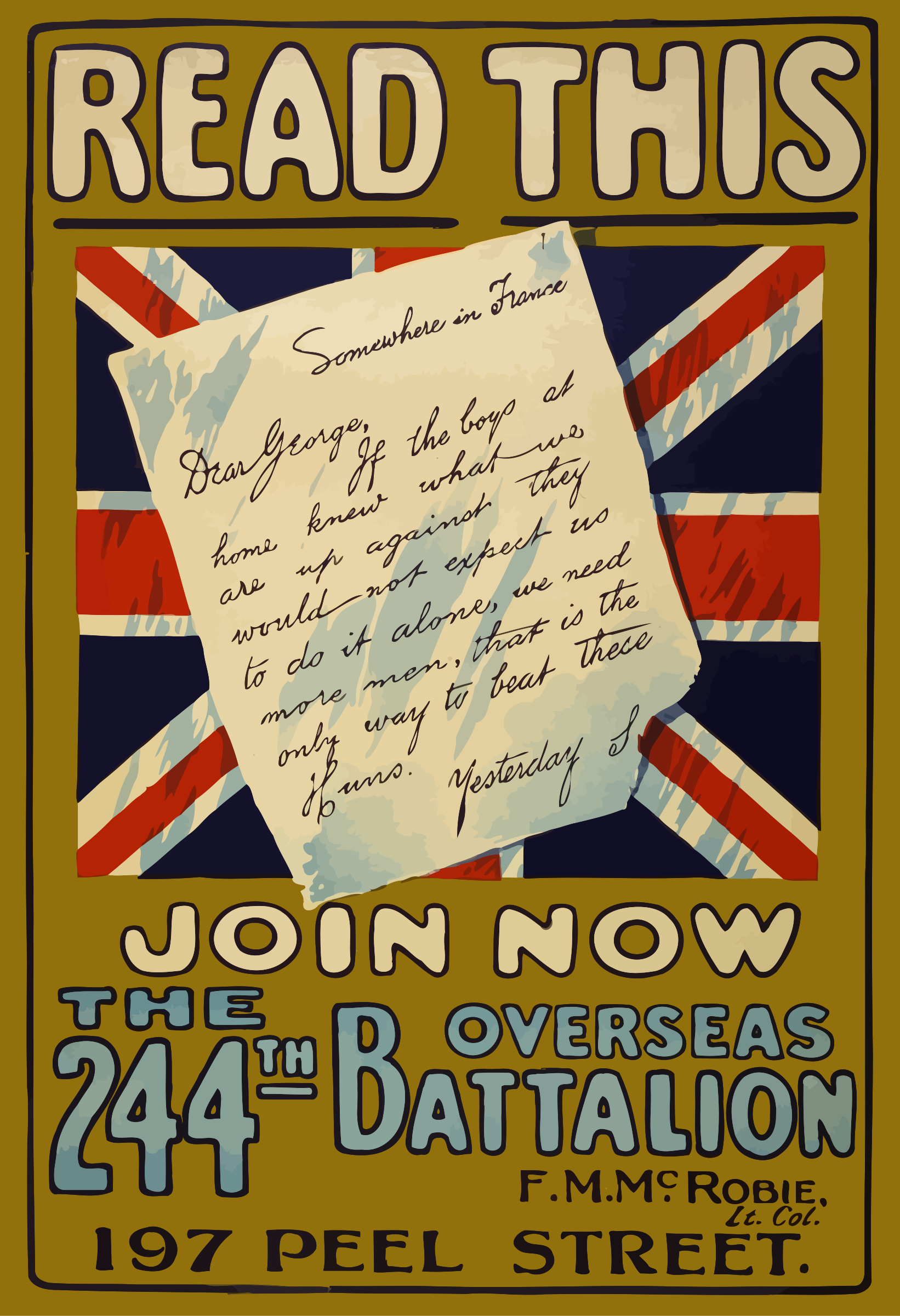 This is a vintage poster advertising the 244th Battalion, which appears to be an overseas battalion. The poster features a British flag and a letter written by someone who has joined the battalion. The letter is addressed to someone named "Dear Friend," expressing gratitude for their support and encouragement during the recruitment process. The poster also includes a call-to-action, inviting people to join the battalion as well.