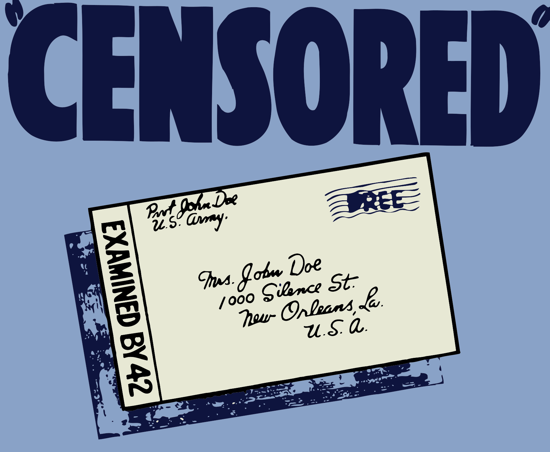 This features a postcard with the words "Censored" written on it. The postcard is addressed to someone named John Doe at 10100 St. Charles Ave., New Orleans, Louisiana, USA. It appears that the content of the postcard has been deemed inappropriate or offensive and thus labeled as "Censored."