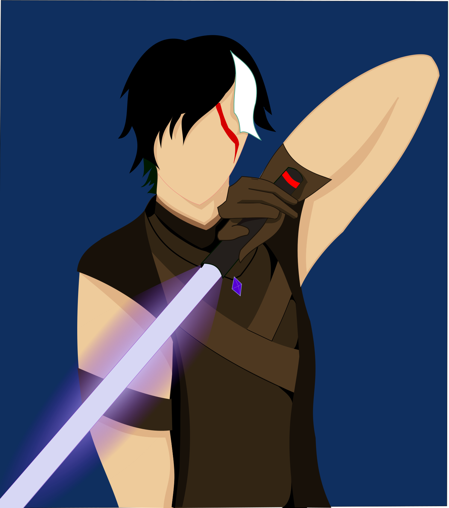 This features a cartoon character with a sword, standing in front of a blue background. The character is wearing a brown shirt and has a purple item on their shoulder. They are holding the sword in one hand while touching their neck with the other hand. The overall scene appears to be an artistic representation of the character's action or pose.