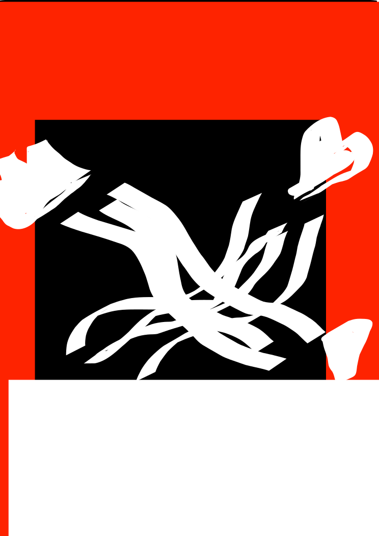 This features a red and black square with an odd-shaped object in the center. This object appears to be made up of several pieces, including a hat, a pair of scissors, and a spoon. The hat is positioned on top of the other objects, while the scissors are located below it. The spoon can be seen at the bottom right corner of the image. The overall composition creates an interesting visual effect that draws attention to the central object.
