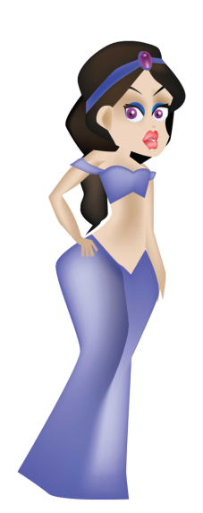 This features a cartoon character, possibly an Arabian princess or a similar character, wearing a purple dress. She is standing in front of a brown background and appears to be posing for the camera. Her outfit consists of a long purple gown that accentuates her figure, giving her a confident and elegant appearance. The cartoon character's facial expression suggests she might be making a playful or sassy face, adding personality to the image.