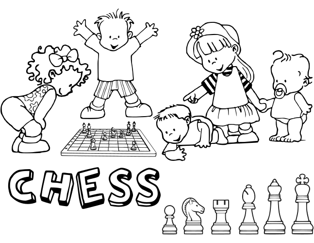 This features a group of children playing chess, with five kids in total. They are all gathered around a chessboard, which is placed on the ground. Each child has their own unique expression and posture as they engage in the game. There are six chess figures visible at the bottom right side of the image, adding to the overall atmosphere of the scene. The children appear to be enjoying themselves while playing this classic board game.