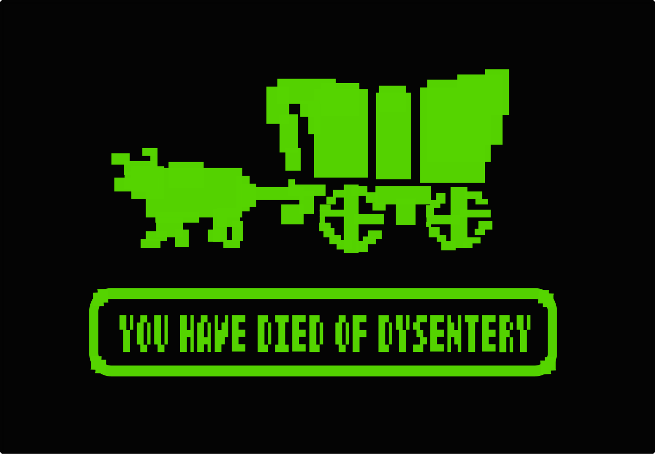 This features a green wagon being pulled by an animal, with the words "You have died of dysentery" written underneath it. This is a reference to the classic computer game Oregon Trail, which was known for its humorous and sometimes gruesome endings. The background of the picture is black, giving the image a retro or vintage feel.