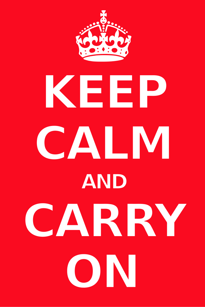 This features a red and white sign that reads "Keep Calm and Carry On." This phrase is written in bold, white letters on the red background. The design of the poster gives it an old-fashioned appearance, reminiscent of vintage posters from earlier times. The phrase itself has become a popular catchphrase that encourages people to stay calm and continue with their daily activities despite any challenges or difficulties they may face.