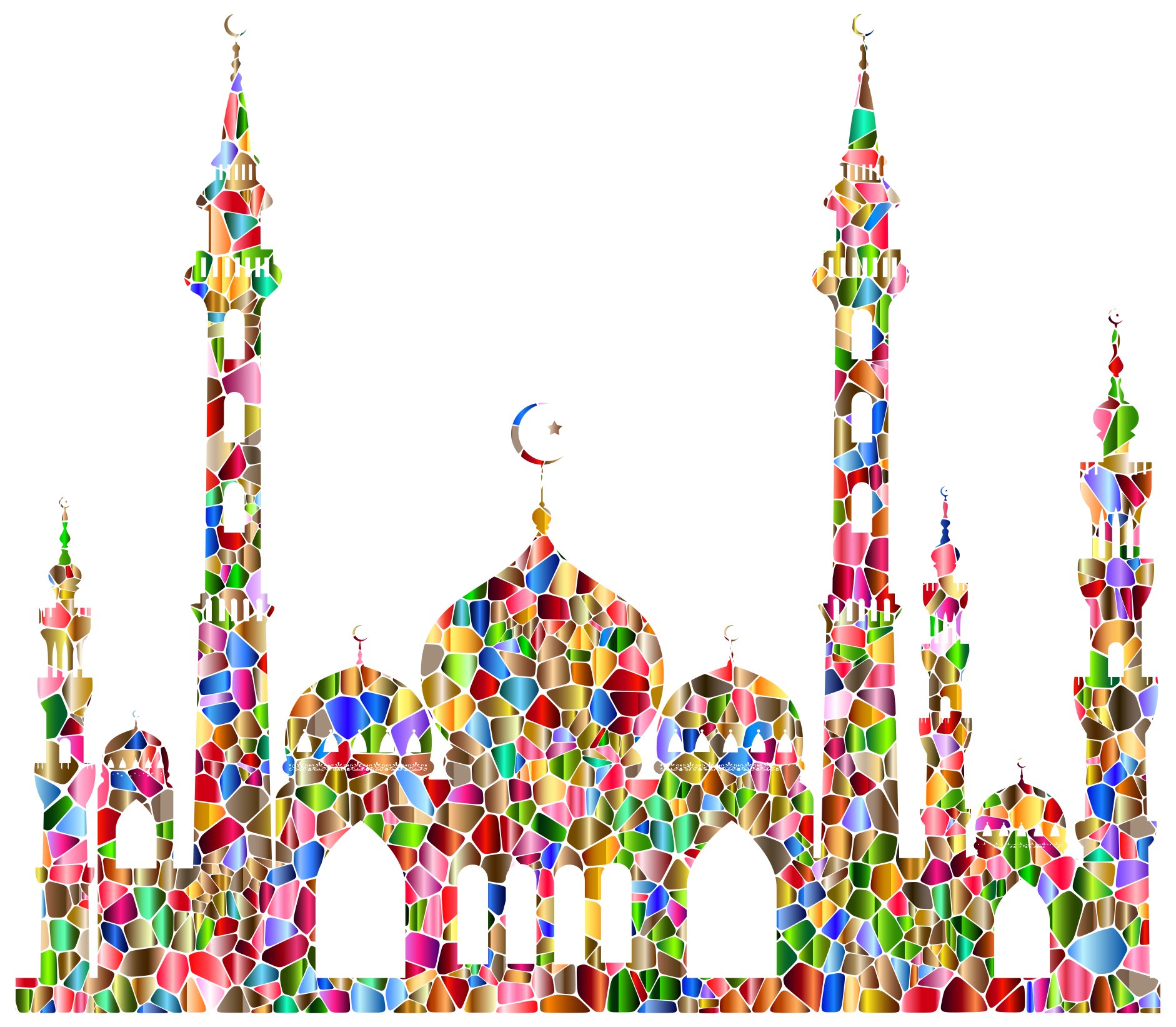 This features a beautifully detailed illustration of several mosques, each with its own unique design. These mosques are adorned with colorful and intricate patterns, creating an eye-catching display. In the center of the scene, there is a large mosque that stands out among the others. Above this central mosque, a crescent moon can be seen, adding to its prominence in the composition. The overall effect is one of harmony and beauty, showcasing the architectural marvels of these religious structures.