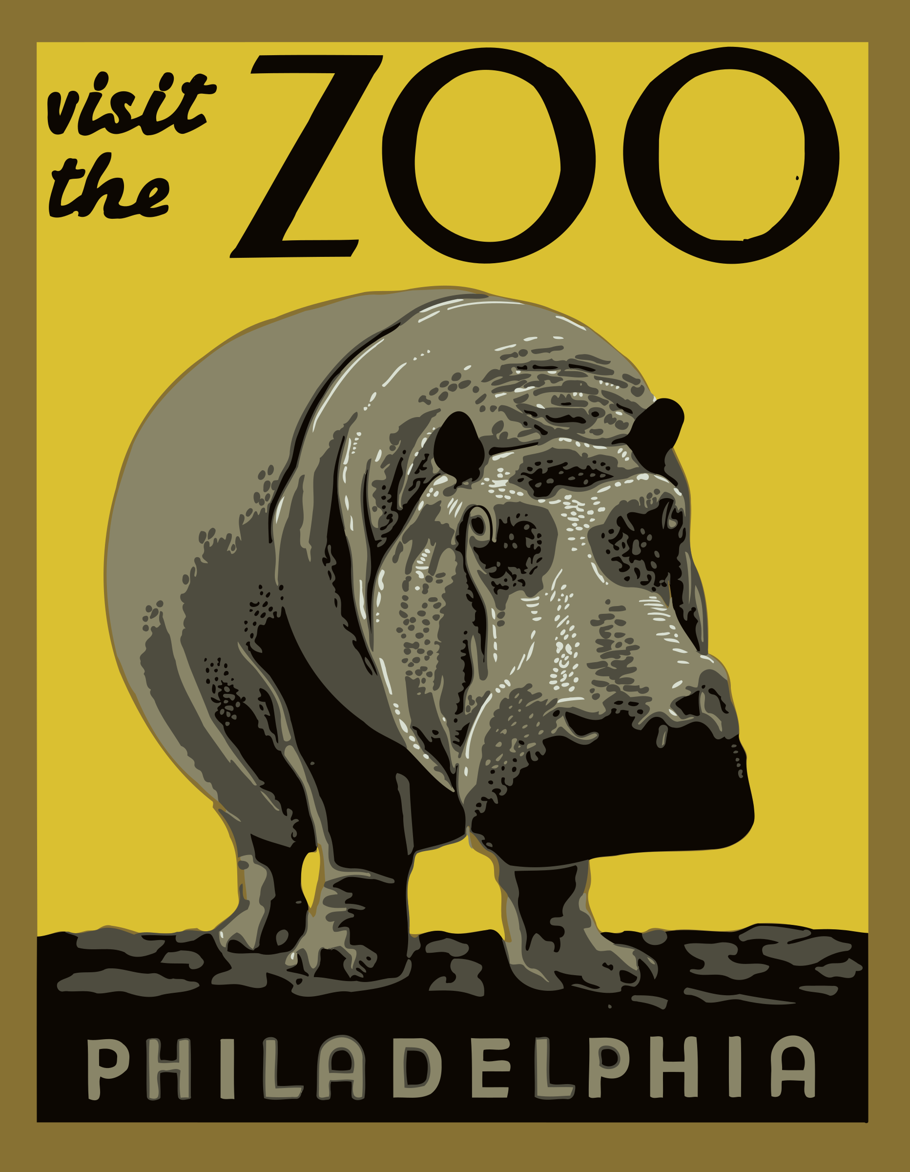 The poster is a large advertisement for the Philadelphia Zoo. It features an illustration of a hippo, which is prominently displayed on the front of the poster. The background color is yellow and there is a dark yellow outline around the image. The text "Visit the Zoo in Philadelphia" is written at the top of the poster, inviting people to visit this popular zoo destination.