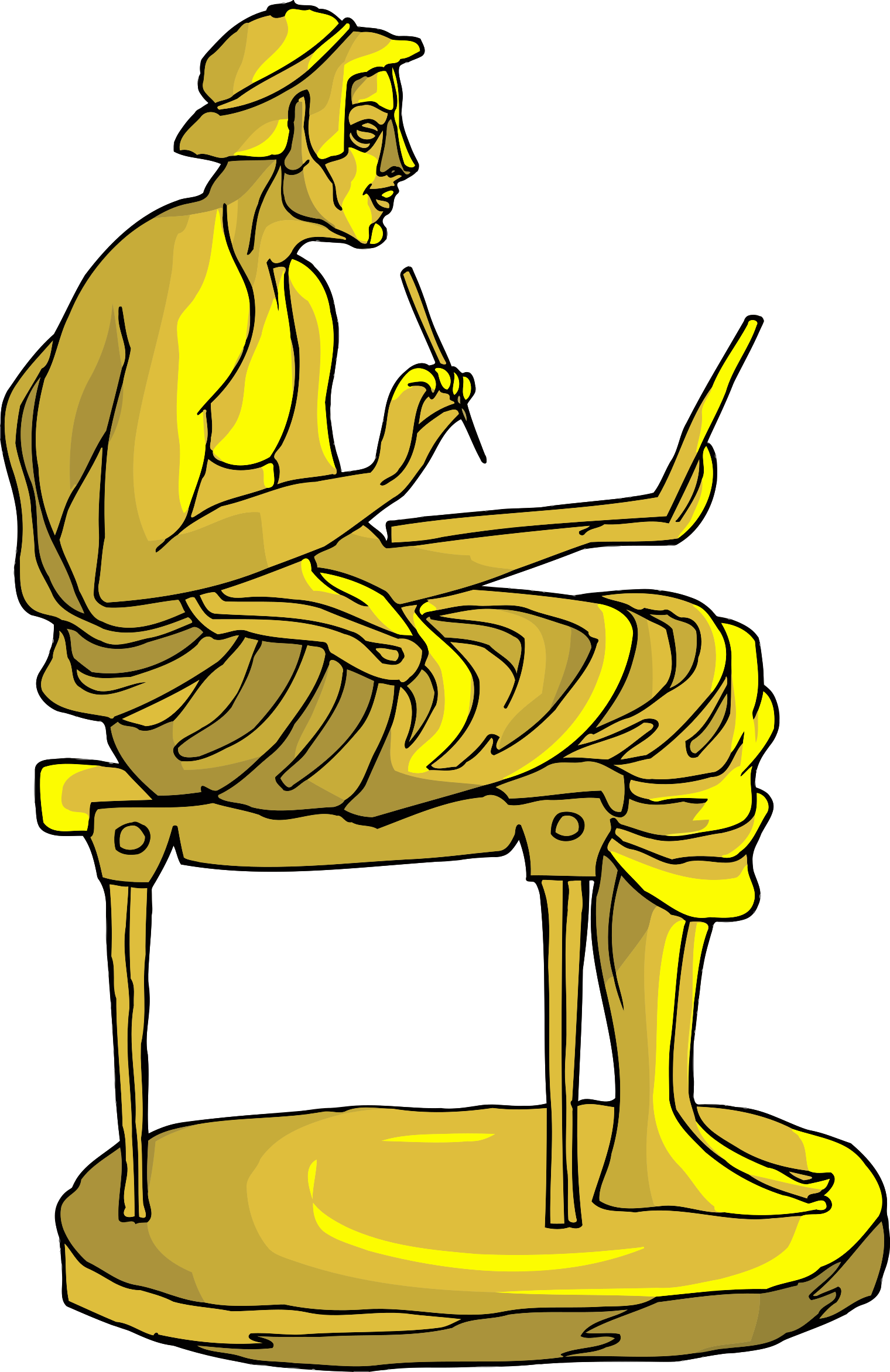 This features a statue of a man sitting on a chair, holding a pencil and an open laptop. He appears to be working or studying while seated in the chair. The statue is made of gold material, giving it a shiny appearance. The chair itself has four legs supporting its structure, providing stability for the statue. Overall, this artistic representation captures the essence of someone engaged in work or study, with a touch of elegance and sophistication due to the golden material used.
