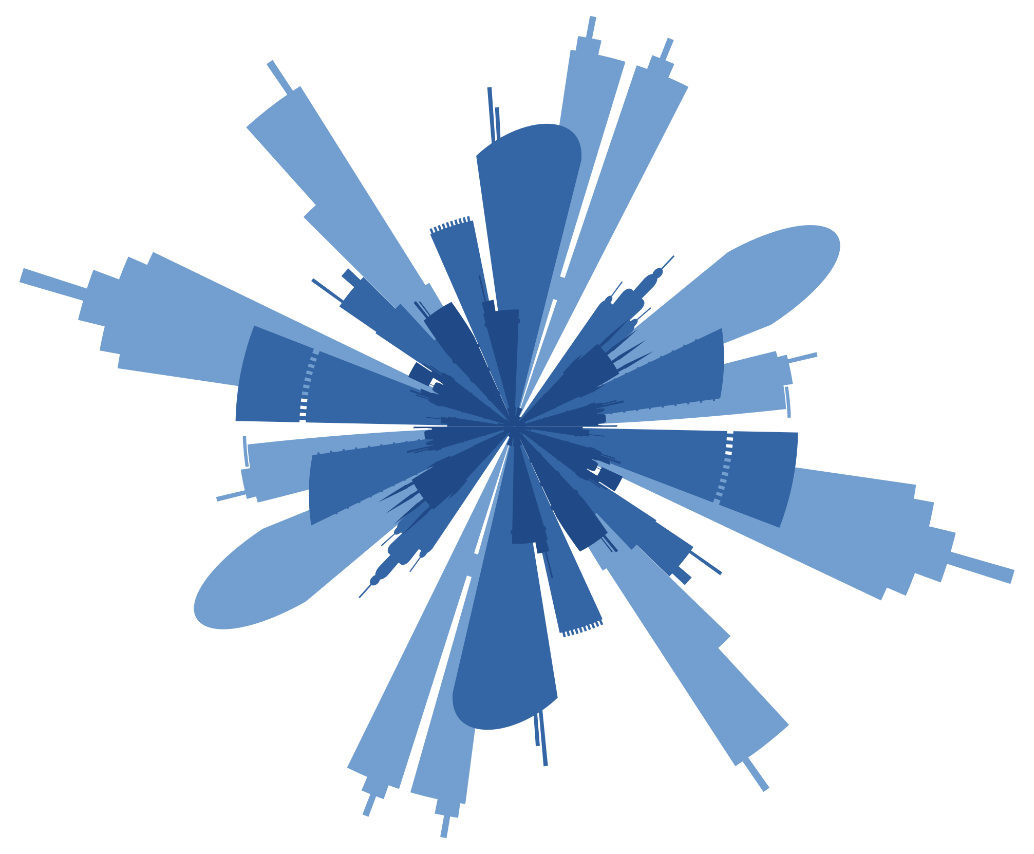 This features a blue and white illustration of various buildings, possibly representing a city skyline. These buildings are arranged in an interesting radial pattern, with some overlapping each other to create a visually appealing composition. The buildings vary in size and shape, adding depth and complexity to the overall design. This artistic representation of a cityscape is both intriguing and captivating for viewers.
