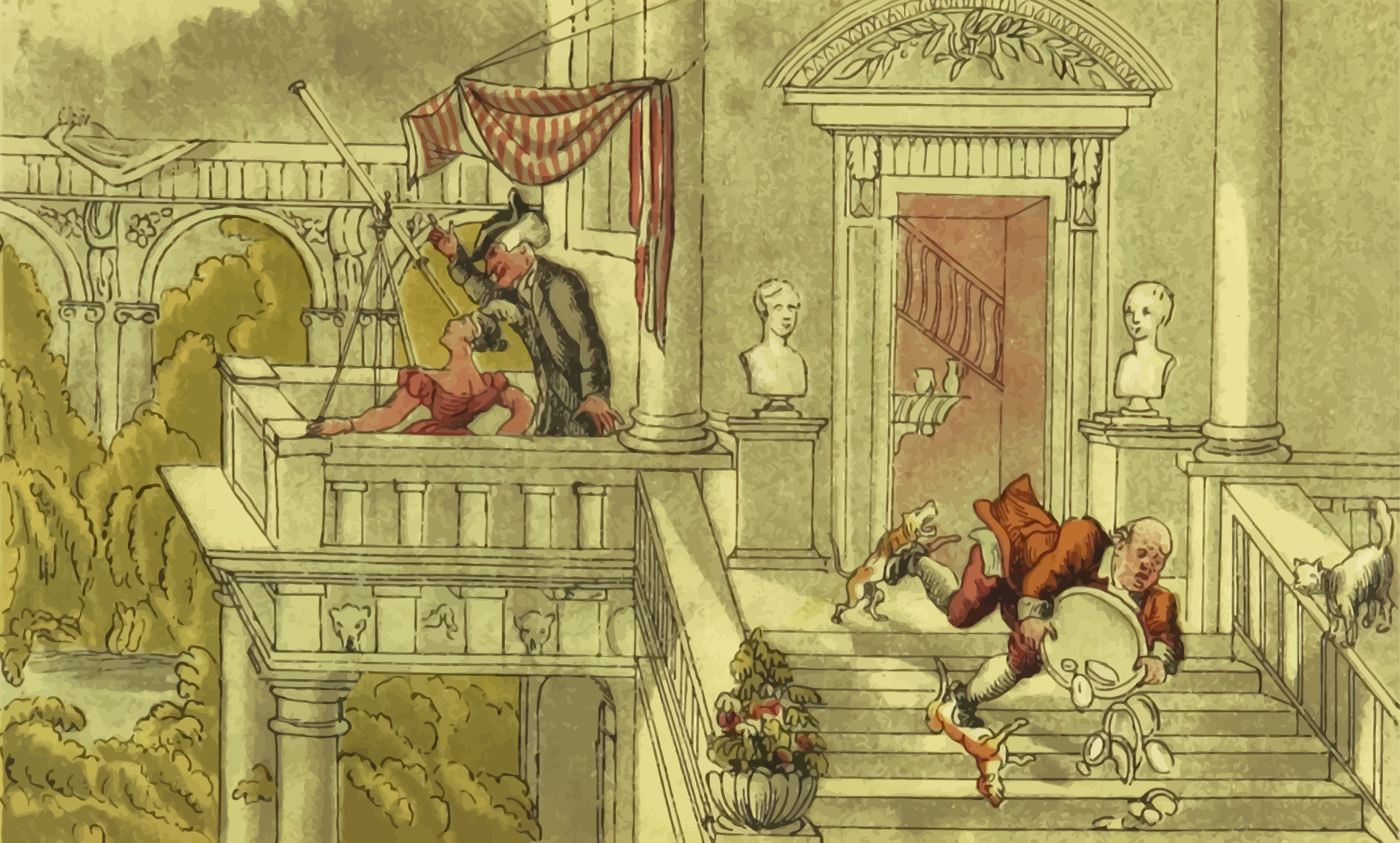 Tags: accident, astronomy, dog, scene, semi-realistic people, servant, slip, stair, telescope, trip