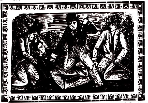 This is a black and white drawing of three men standing in the dirt. They are all wearing ties, which adds to their formal appearance. One man appears to be holding a gun while another has his hands up. The third man seems to be looking at something off-camera. The scene gives an impression of being from a last dying speeches paper, suggesting that it might have been related to public executions in the past. The drawing is done with two tones, which adds a sense of depth and intrigue to the image.