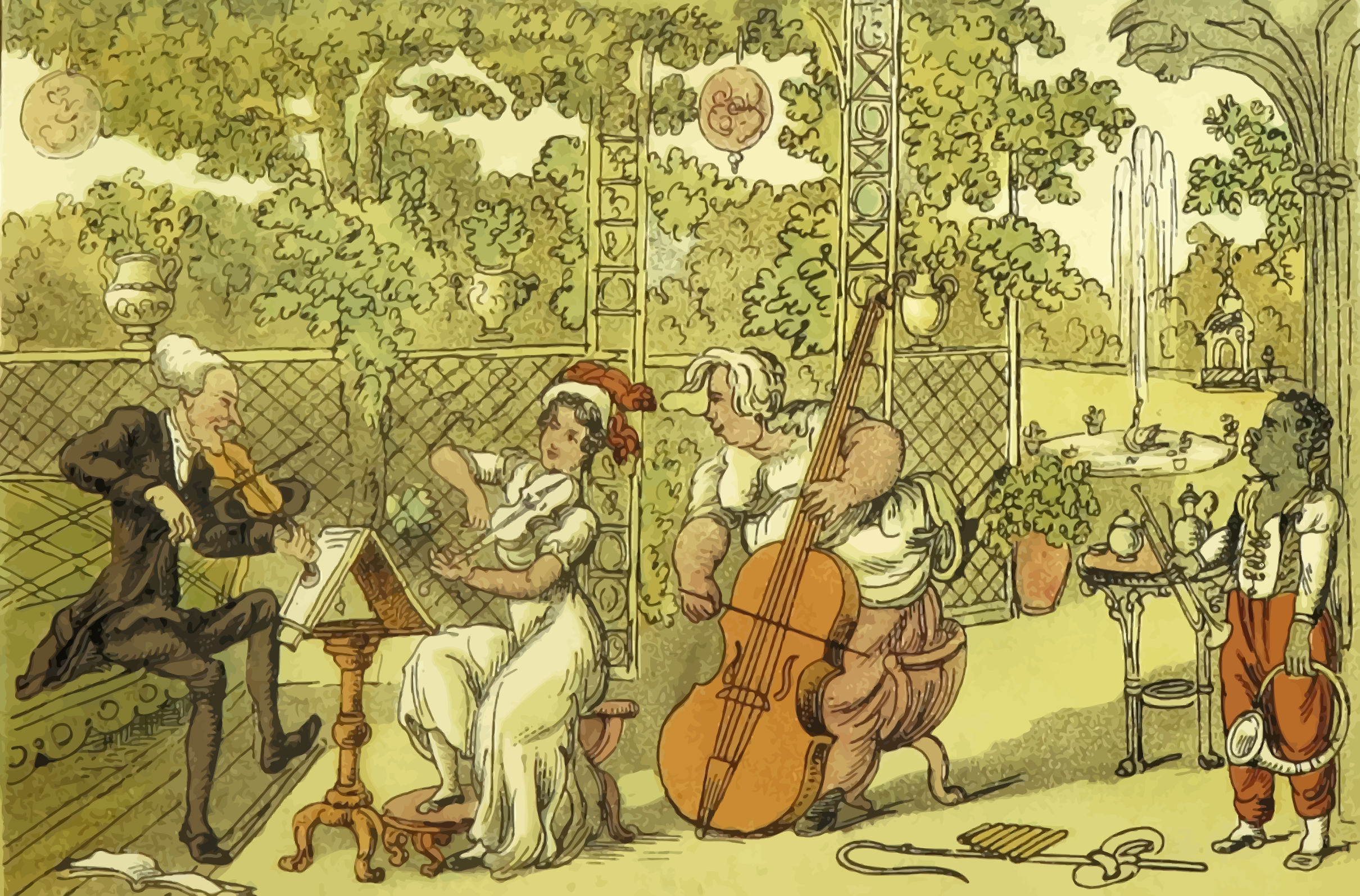 Tags: bass, double bass, garden, music, musician, performance, performer, scene, trio, violin, trio garden