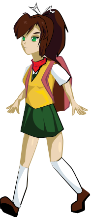 This features a young girl dressed in school uniform, walking with her hands at her sides. She is wearing a backpack and has a red ribbon tied around her neck. Her outfit includes a yellow vest over a green skirt, giving the impression of a cheerful and energetic character. The girl appears to be enjoying her walk as she confidently strides through the scene.