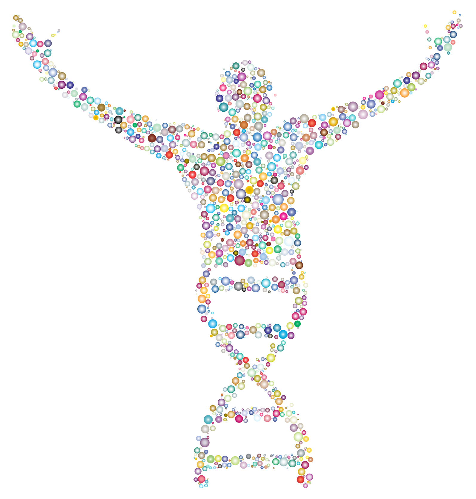 This features a large, colorful representation of a human body made up of various colored circles. These circles are arranged in such a way that they form the shape of a person's torso and arms. The circles are scattered all over the body, with some placed on top of each other to create depth and texture. This unique artistic display is reminiscent of a DNA strand, showcasing the intricate structure of human anatomy in a visually appealing manner.
