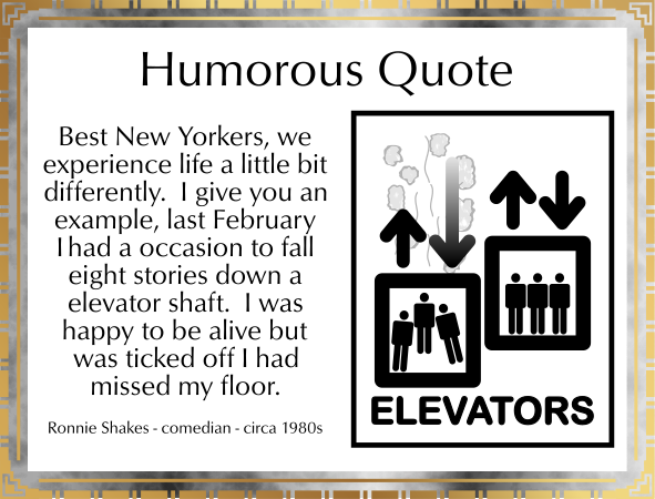 This is a poster featuring a quote from comedian Ronnie Shakes, who was active in the 1980s. The quote is about elevators and is written in a humorous manner. It reads "Best New Yorkers, we experience life a little bit differently. I give you an example: last February had an occasion to fall down an eight story elevator shaft. I was tickled off my feet." This poster likely serves as a decoration or conversation starter for those who appreciate humor and the unique perspective of Ronnie Shakes' comedic style.