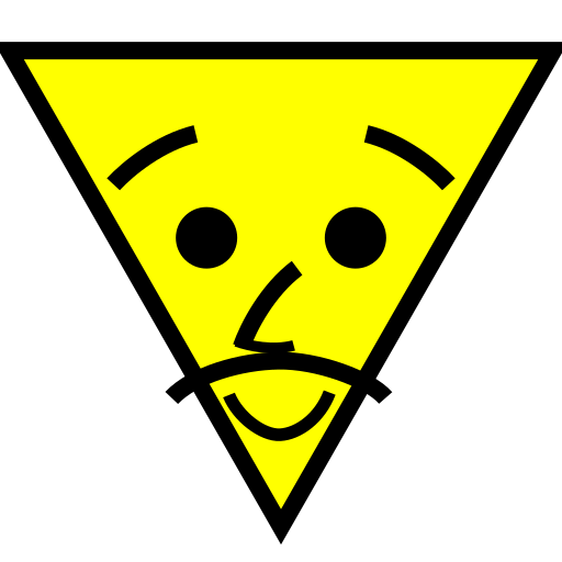 This features a yellow triangle with a smiling face drawn on it. The face has a mustache and is wearing glasses, giving the impression of a happy and friendly character. This unique design could be used for various purposes such as an emblem or logo, representing a fun and lighthearted atmosphere.