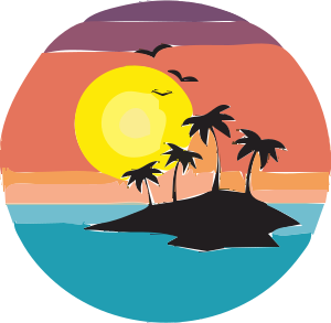 This features a beautiful sunset over the ocean, with a small tropical island in the foreground. The sky is painted in warm colors, creating an idyllic atmosphere. On this island, there are three palm trees standing tall and proudly, adding to the serene scene. In addition to the palm trees, there are also two birds flying gracefully through the sky, further enhancing the picturesque view of the sunset. The combination of the ocean, tropical island, and birds creates a peaceful and inviting image that captures the essence of a perfect day by the sea.
