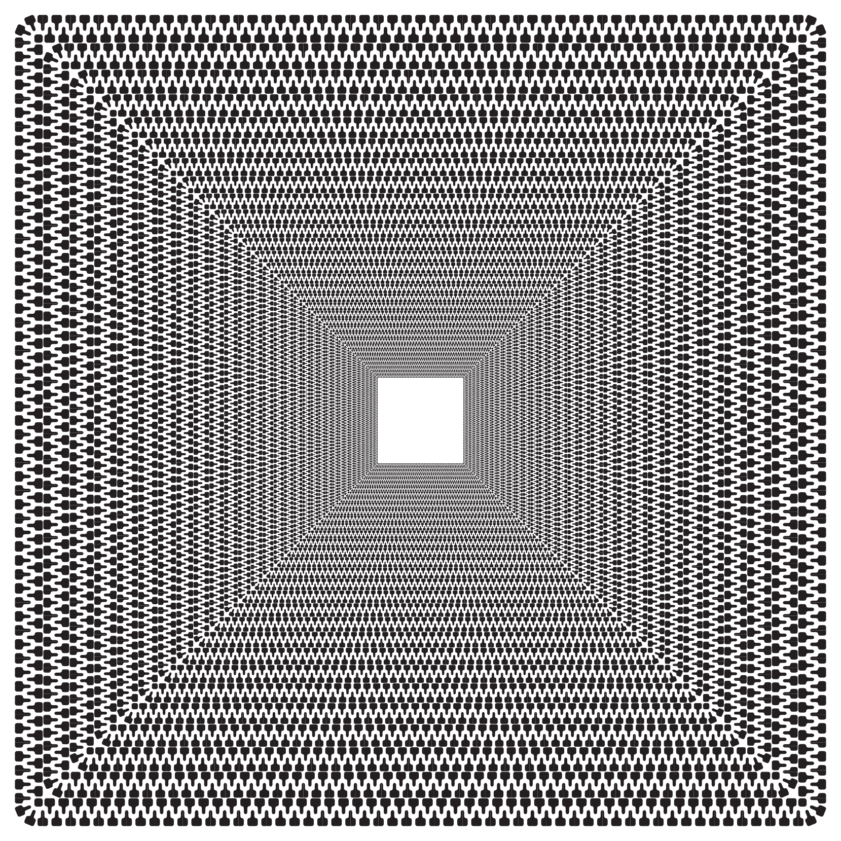 This features a black and white patterned design with a central square. This square is surrounded by a series of smaller squares, creating an intricate and visually appealing pattern. The overall composition of the image gives off a sense of depth and complexity, as the individual squares are interconnected to form a cohesive whole. The contrasting colors of black and white add a striking visual effect that draws attention to the central square and its surrounding elements.