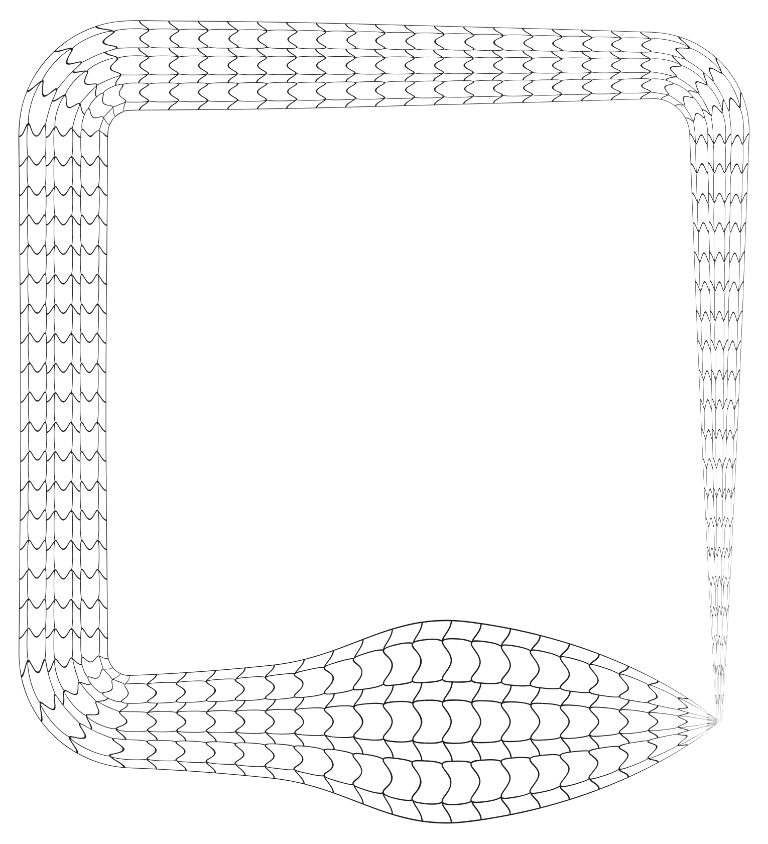 This features a square with a white background, and it is filled with a pattern of interconnected lines. These lines create an intricate design that covers the entirety of the square. The lines are arranged in such a way that they form a complex web-like structure, giving the impression of a snake or a similar creature. This unique pattern adds visual interest to the otherwise simple white background.