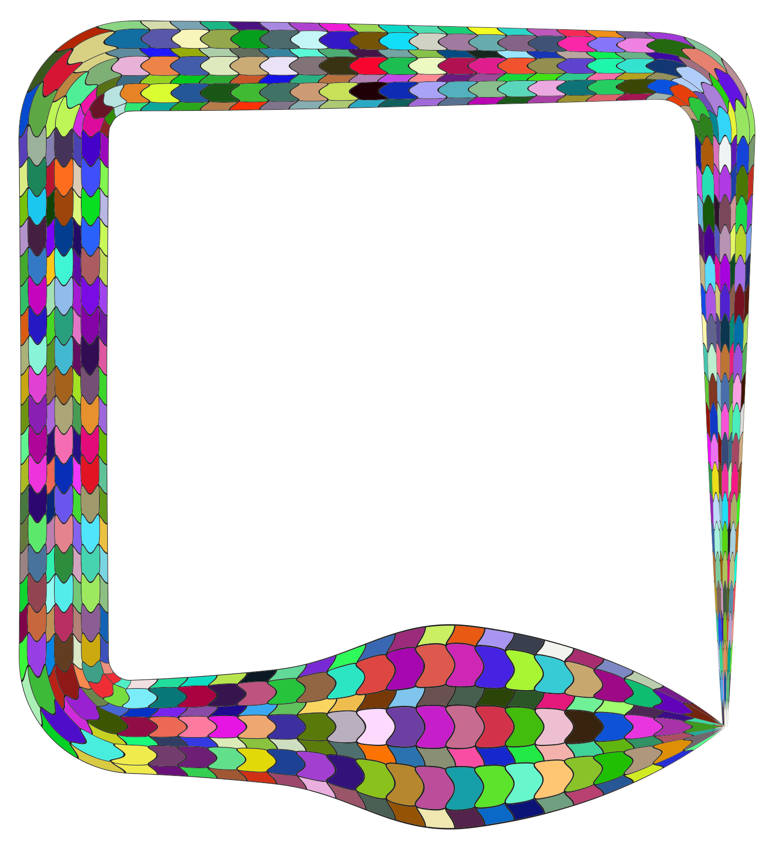 This features a colorful, abstract design with a square shape. Inside the square, there is an empty space that appears to be a frame or border. This unique design has a vibrant and lively appearance, making it visually appealing. The colors used in this artwork are diverse and bold, creating a striking contrast against the white background. Overall, the image exudes creativity and energy through its colorful composition.