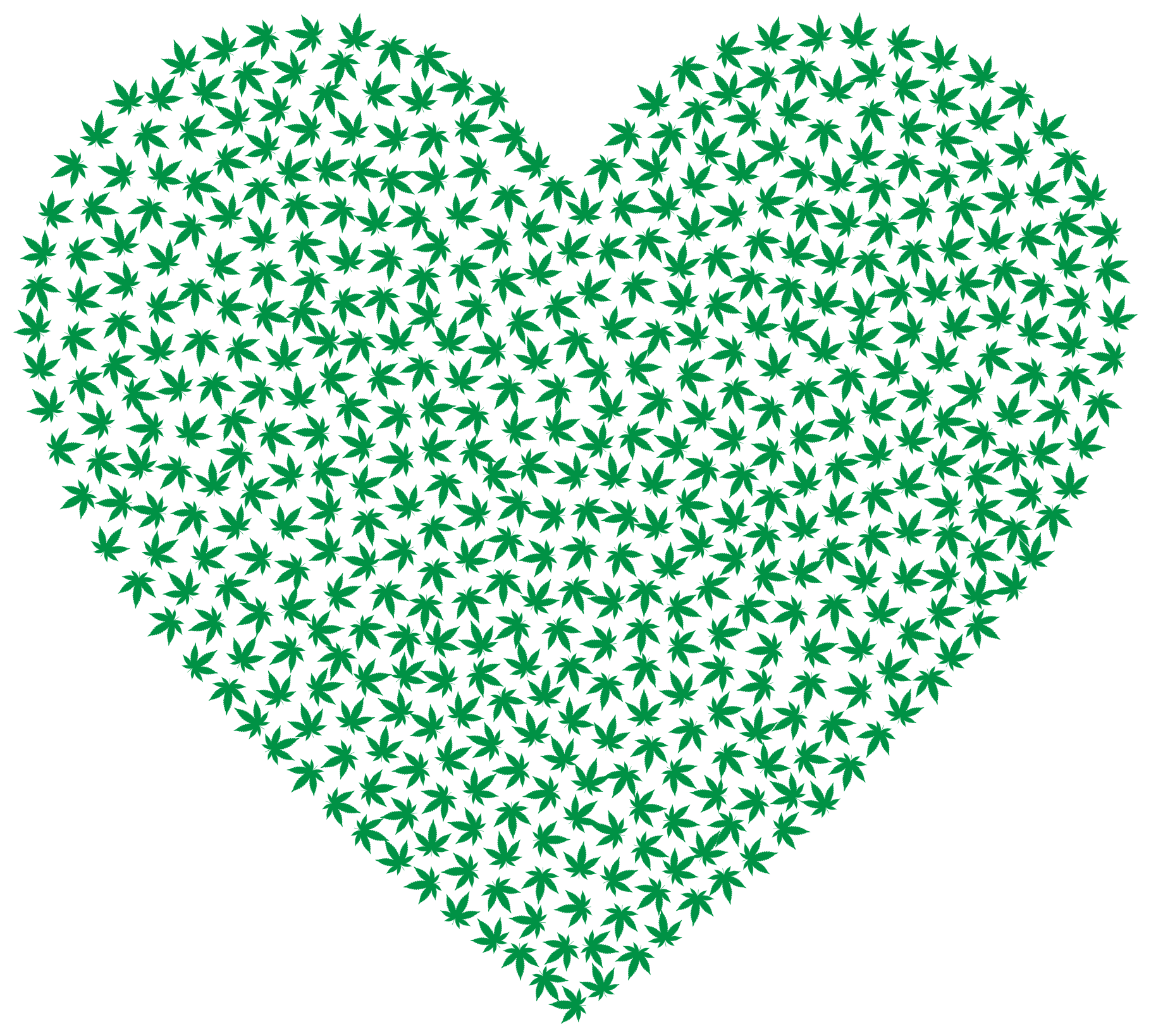 This features a large, heart-shaped design made up of numerous small marijuana leaves. These leaves are scattered all over the heart in various positions and orientations, creating a visually striking pattern. The overall effect is that of a close-up view of a marijuana plant with its leaves intact, showcasing the intricate details of the plant's structure.