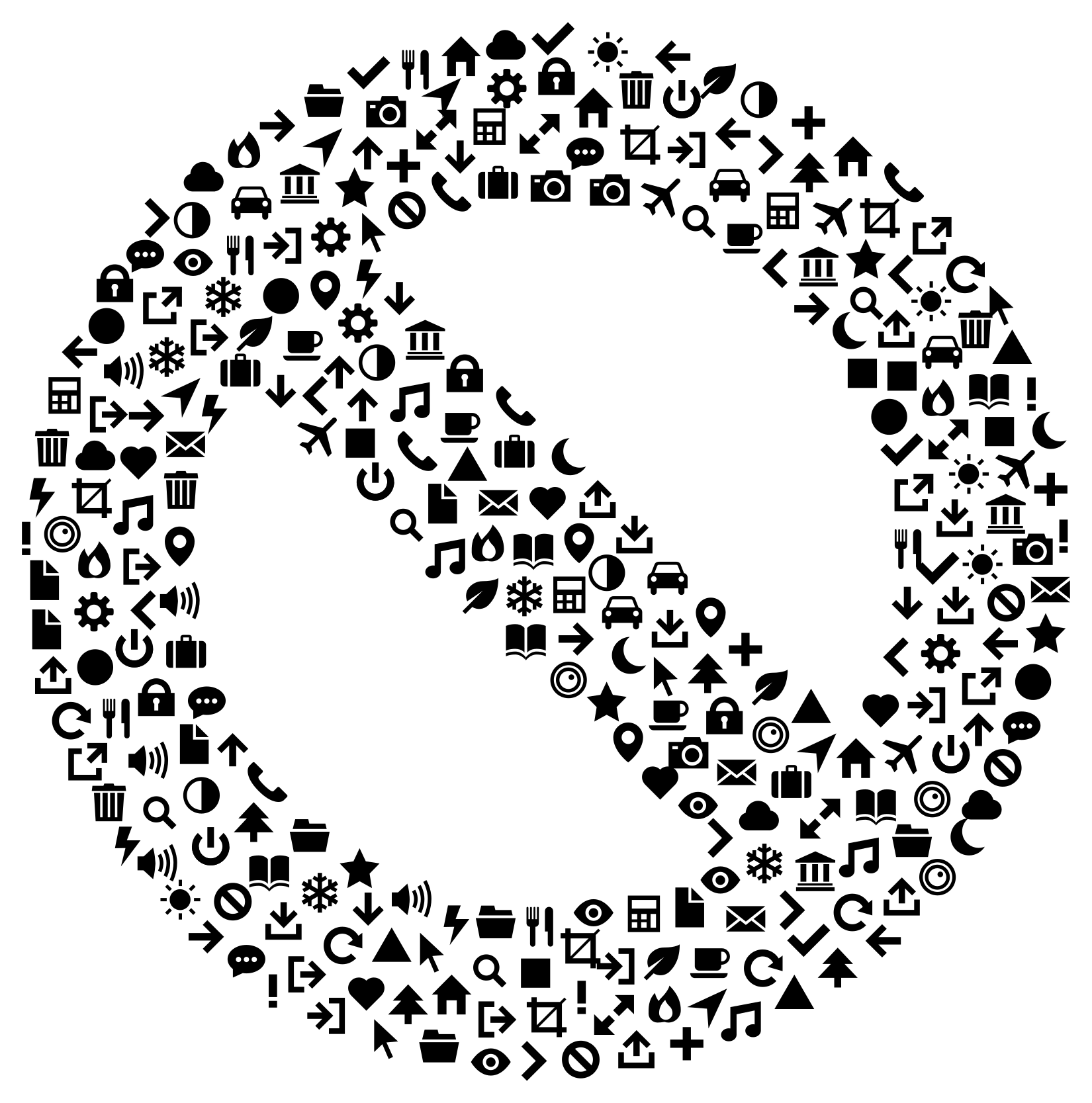 This is a close-up of an icon, which appears to be a circle with various symbols and icons inside it. These symbols include a car, a clock, a book, a camera, a house, a person, a star, a heart, and several other objects. The icons are arranged in such a way that they fill the entire circle, creating an intricate pattern of shapes and symbols. This image could be used to represent a variety of concepts or ideas related to technology, communication, or social media.