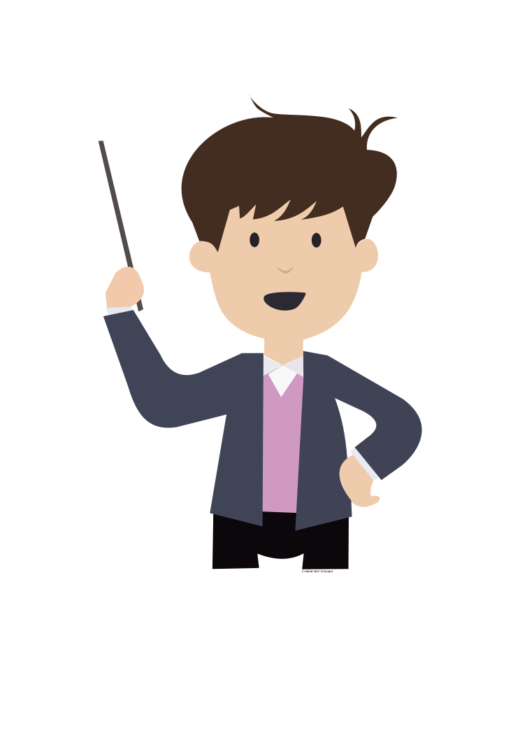 This features a cartoon character, possibly a young boy or a man, dressed in a suit and holding a conductor's baton. He appears to be standing on stage, possibly giving a performance or directing an ensemble. The character is wearing a tie, which adds to the formality of his attire. The overall scene gives off a sense of confidence and authority as he holds the baton in hand.