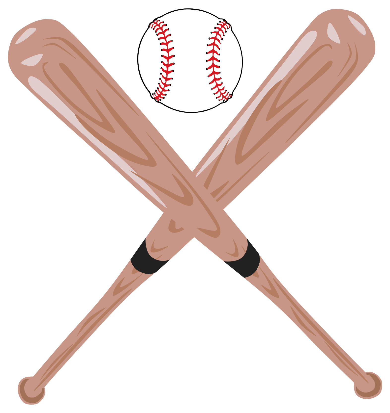 This features a baseball bat with two wooden handles, one on the left and another on the right. A baseball is placed in the center of the bats, creating an iconic symbol for the sport. The baseball bat is positioned horizontally across the entire frame, while the baseball is slightly elevated above it. This illustration showcases a classic representation of baseball equipment, emphasizing the importance of the bat and ball in the game.