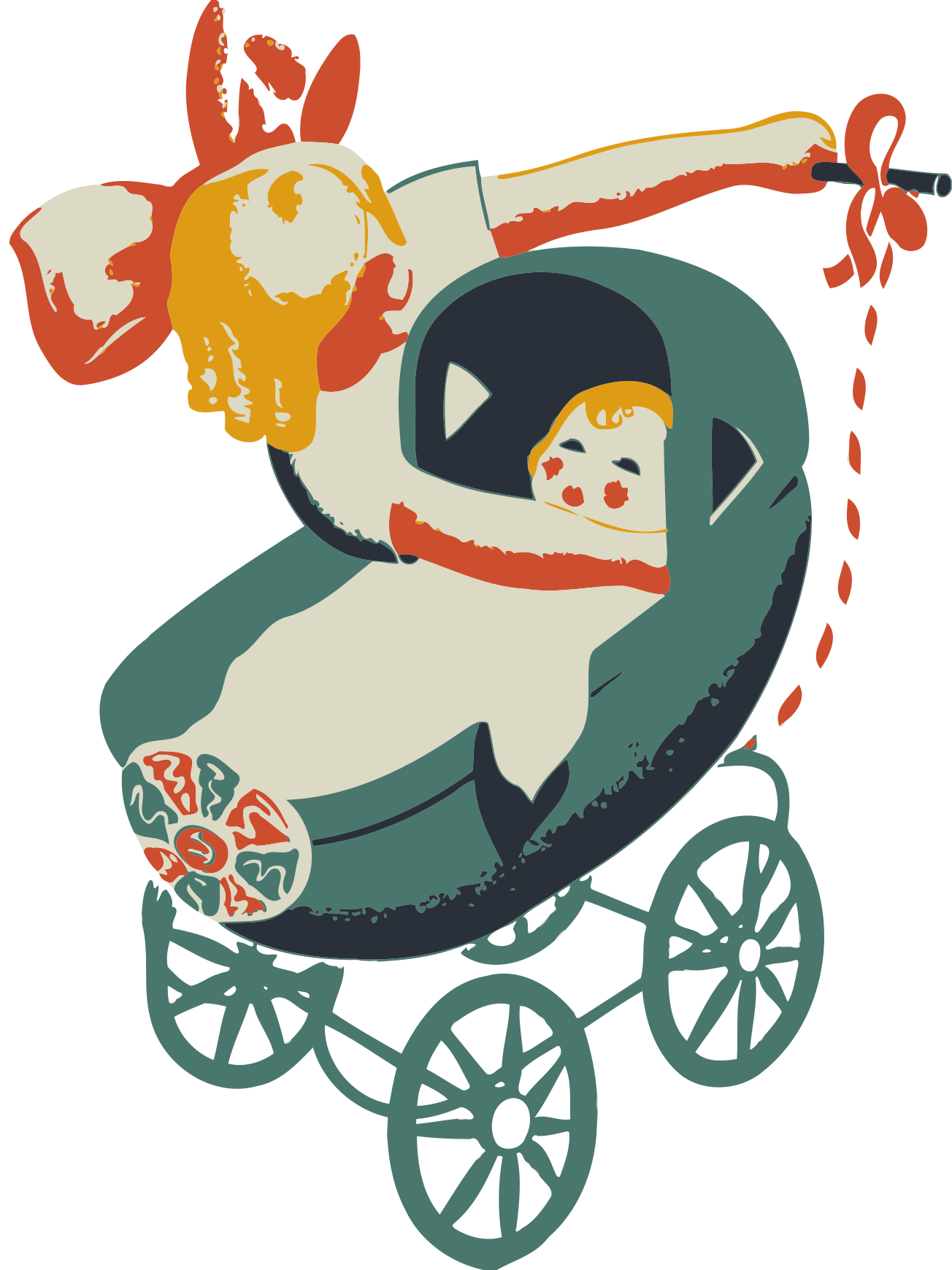 This features a colorful cartoon illustration of a woman holding a baby in a stroller. She is wearing a dress and appears to be the main focus of the scene. In addition, there are two teddy bears present in the illustration, one located near the top left corner and another towards the bottom right side. The overall composition creates an artistic and playful atmosphere.