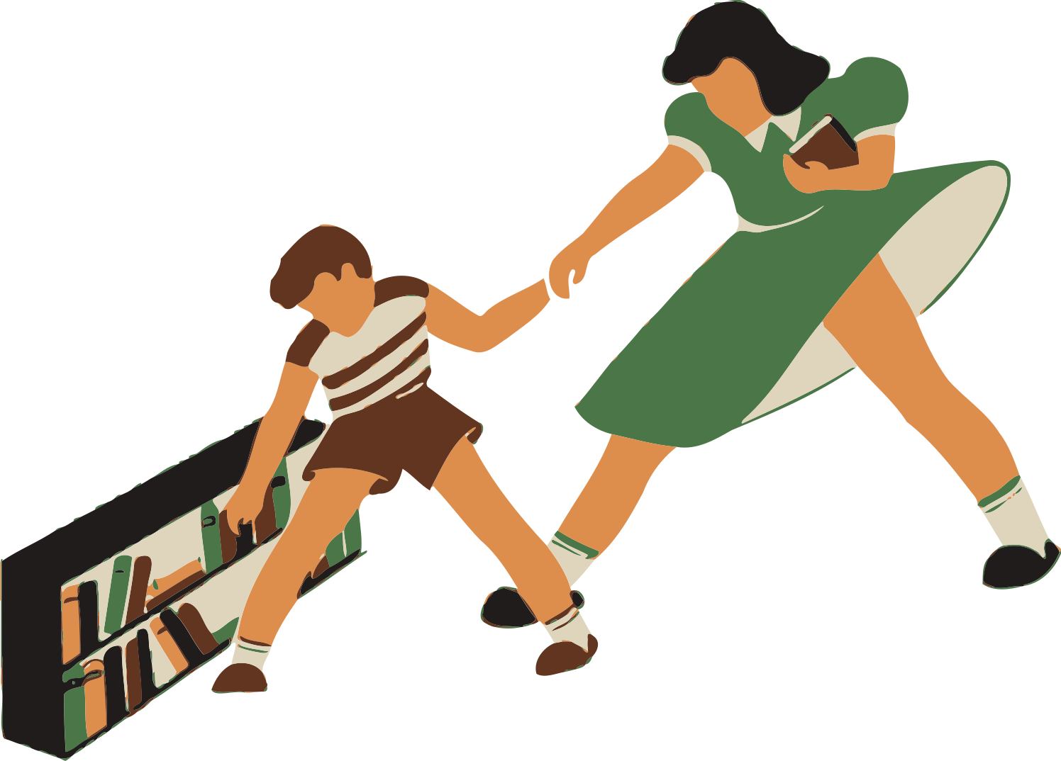 This features a woman and a young boy standing next to each other, with the woman holding the boy's hand. They are positioned in front of a bookshelf filled with various books. The woman appears to be guiding or helping the child as they stand together. The scene is reminiscent of an old-fashioned advertisement for children's books, which adds a nostalgic touch to the image.
