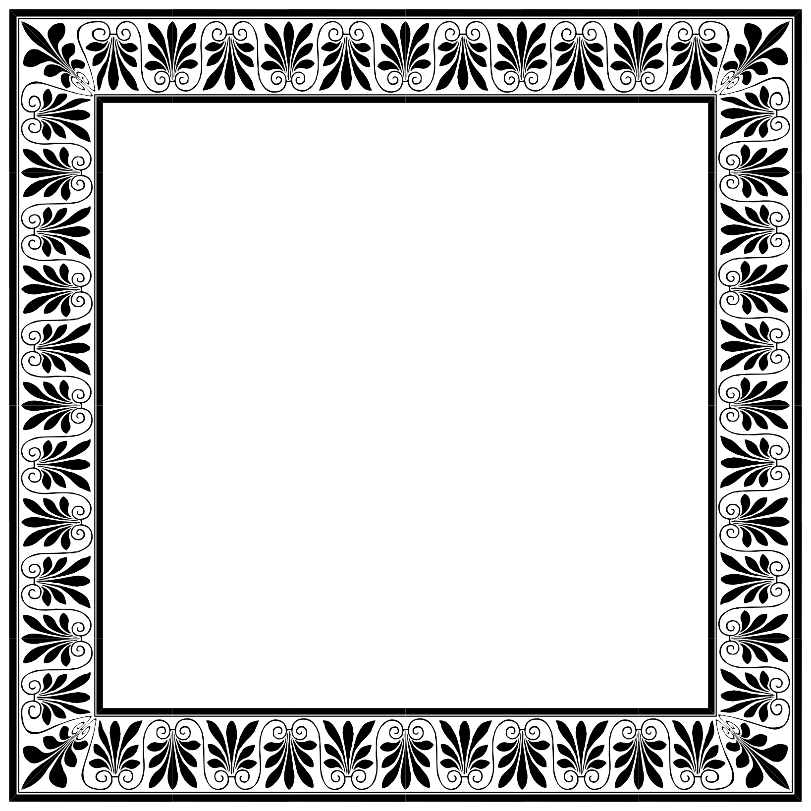 This features a black and white design with an ornate border. Inside the frame, there is a large empty space that appears to be a square or rectangle shape. This design could be used as a decorative element for various purposes such as artwork, photographs, or other visual content. The intricate details of the border add a touch of elegance and sophistication to the overall appearance of the image.