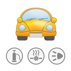 This features a yellow car with its hood open, showcasing the engine and other components. There are three icons below the car, which appear to be related to automotive maintenance or repair. These icons may represent tools such as wrenches, screwdrivers, or other equipment commonly used in vehicle servicing. The overall scene gives an impression of a car being worked on or inspected for potential issues.