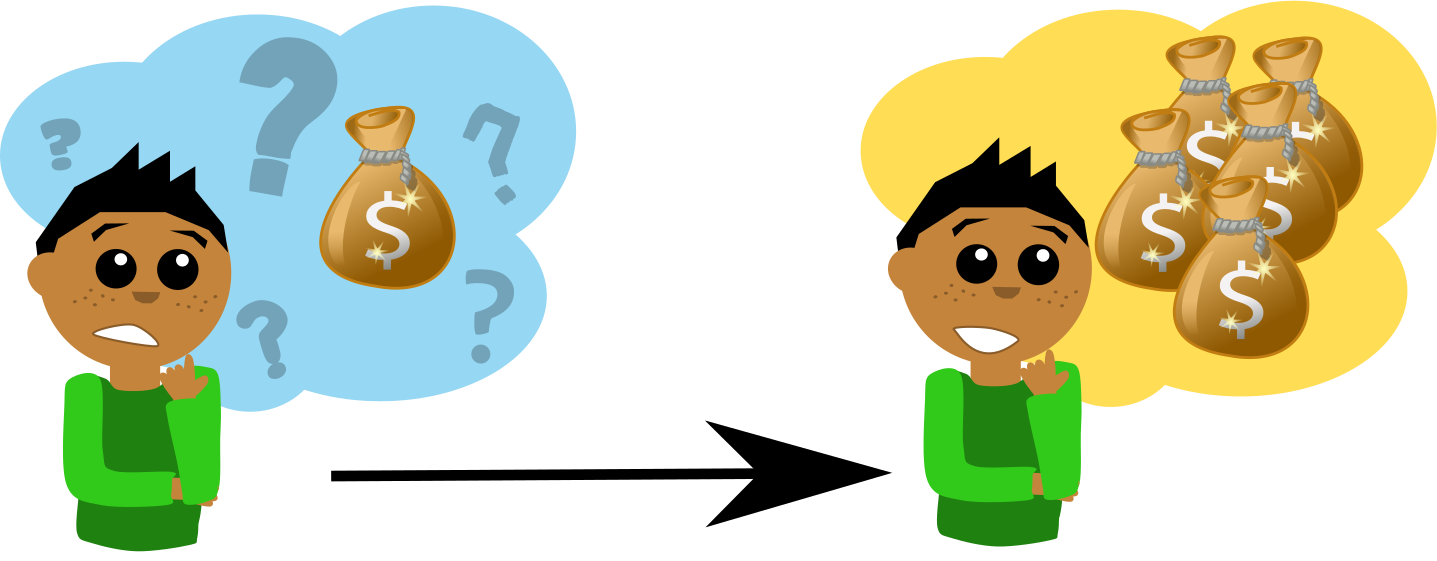 This features a man with black hair and a green shirt, who is sitting down and thinking about money. He appears to be contemplating how to go from having no money to having a lot of it. In the background, there are several bags of money scattered around, indicating that he might be considering various financial strategies or options for increasing his wealth. The scene conveys a sense of thoughtfulness and determination as the man focuses on his financial goals.