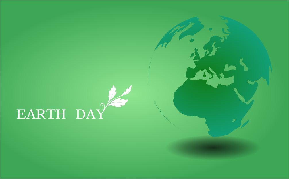 This features a green background with a large, round globe of the Earth prominently displayed. Above the globe, there is a leaf and a branch, adding an element of nature to the scene. The text "Earth Day" is written in white letters on the green background, emphasizing the theme of the image. This artistic representation of our planet highlights its beauty and importance as we celebrate Earth Day.