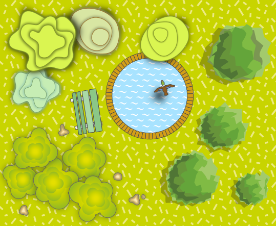 This features a park scene with various elements. In the center of the park, there is a pond surrounded by trees and plants. A bird can be seen sitting on top of the water in the middle of the pond. Nearby, there are several benches placed around the area for visitors to sit and enjoy the view. Additionally, there are multiple chairs scattered throughout the scene, providing more seating options for park-goers. The overall atmosphere is serene and inviting, with a mix of natural elements such as plants, trees, and water creating a picturesque setting.