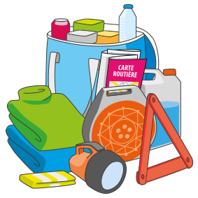 This features a blue cooler filled with various items, including a book titled "Carte Routière." There are also several bottles placed inside the cooler, some of which appear to be water bottles. Additionally, there is an umbrella and a pair of scissors among the contents. A handbag can be seen next to the cooler, possibly containing more items for the trip. The scene suggests that someone is preparing for a journey or outdoor activity with essential supplies in their bag.