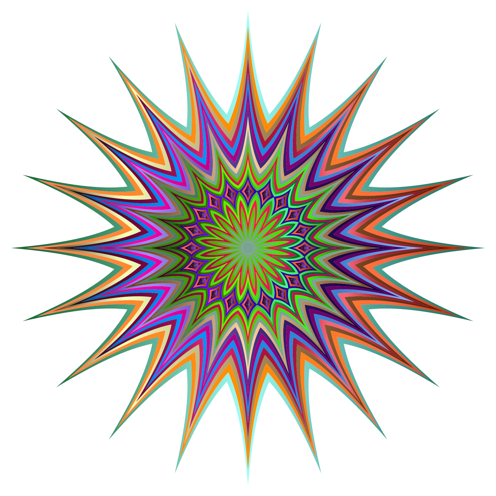 This features a large, colorful star with many points. Each point is sharp and vibrant in color, creating an eye-catching design. The star has a central circle that adds to its visual appeal. The colors used are predominantly purple, green, orange, yellow, blue, and red, making it a striking and unique piece of artwork. The combination of these bright colors creates a sense of depth and complexity in the image, showcasing the intricate details of the star design.