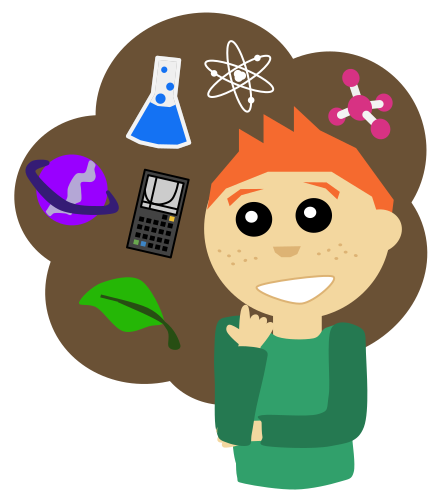 This features a cartoon character with red hair, wearing a green shirt and smiling. He is surrounded by various objects that represent science, including a beaker, a cell phone, a TV remote, a computer mouse, a book, and a bottle of soda. These items are placed around the character in different positions, creating an interesting visual composition. The cartoon character appears to be posing for the camera with these objects surrounding him, giving off a sense of curiosity and playfulness.