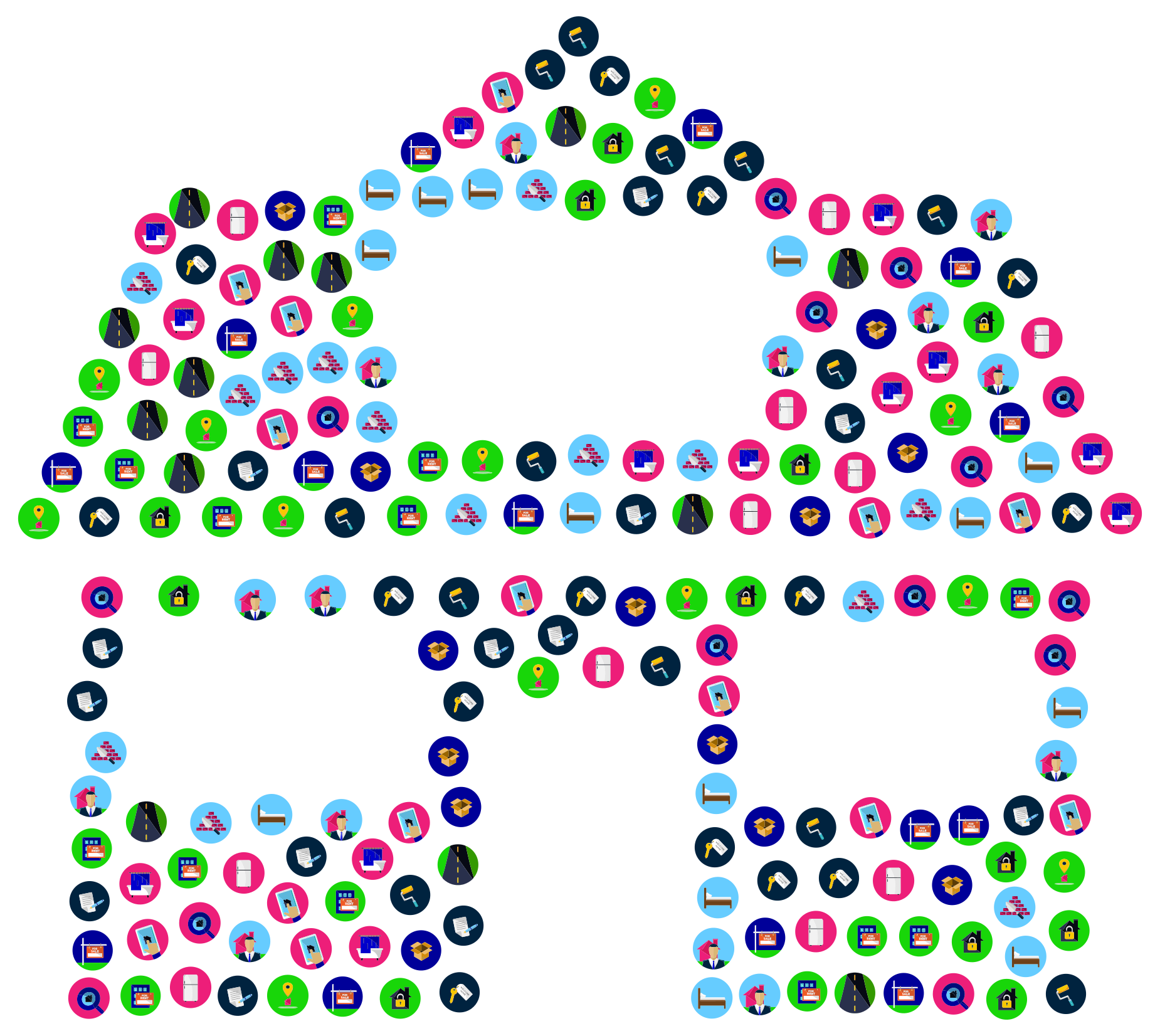 This features a large, colorful house made up of many small houses. These smaller houses are scattered throughout the scene in various positions and orientations, creating a visually engaging composition. Each small house is unique, with different colors and shapes, adding to the overall vibrancy of the scene. The image also includes several people, likely representing inhabitants or visitors within the larger house. These individuals are scattered throughout the scene, some closer to the edges while others are more centrally located. The combination of the large house made up of smaller houses and the presence of people creates a lively atmosphere that invites viewers to imagine themselves in this imaginative setting.