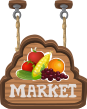 This features a wooden sign with various fruits and vegetables hanging from it. There are apples, oranges, and grapes displayed on the sign, creating an inviting atmosphere for visitors to the market. The sign is prominently placed in the scene, drawing attention to the fresh produce available at this location. The combination of the wooden sign and the colorful fruits creates a warm and welcoming environment that encourages people to visit the market and enjoy its offerings.