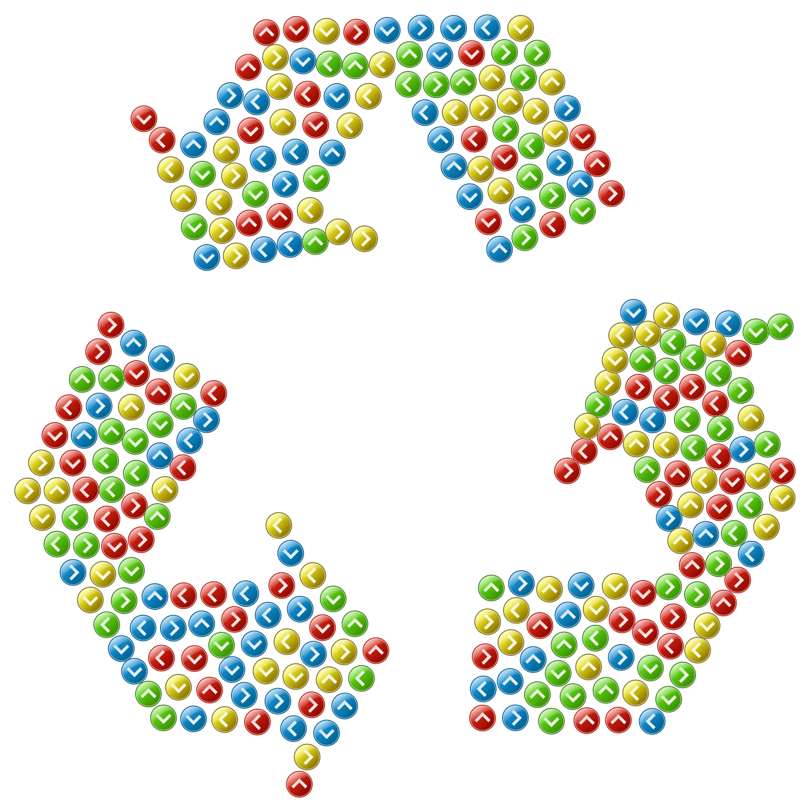 This features a large, colorful recycling symbol made up of various colored balls. The symbol is composed of three main circles, each with different colors and sizes, creating an eye-catching and vibrant display. The balls are scattered throughout the entirety of the symbol, filling in the gaps between the circles and adding a sense of depth to the design. This creative representation of recycling serves as a visually appealing reminder of the importance of environmental conservation and sustainability.